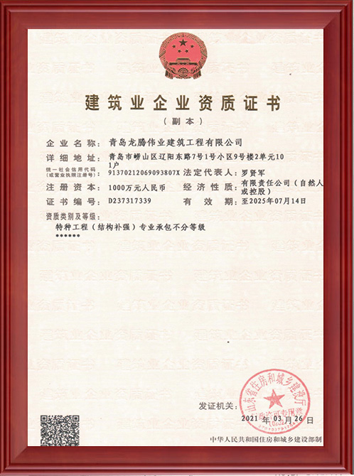 青島龍騰偉業(yè)建筑加固工程有限公司是一家專業(yè)從事工程結(jié)構(gòu)加固設(shè)計(jì)、咨詢、施工集一體的綜合性專業(yè)山東加固公司注冊(cè)資金壹仟萬元,具備特種結(jié)構(gòu)補(bǔ)強(qiáng)專業(yè)工程資質(zhì)。